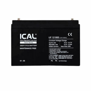 ICAL LIP12100D 12V/100Ah deep cycle lead-acid battery designed to deliver sustained power through repeated charge and discharge cycles. Ideal for solar energy storage, off-grid systems, and backup power where long-lasting performance is critical